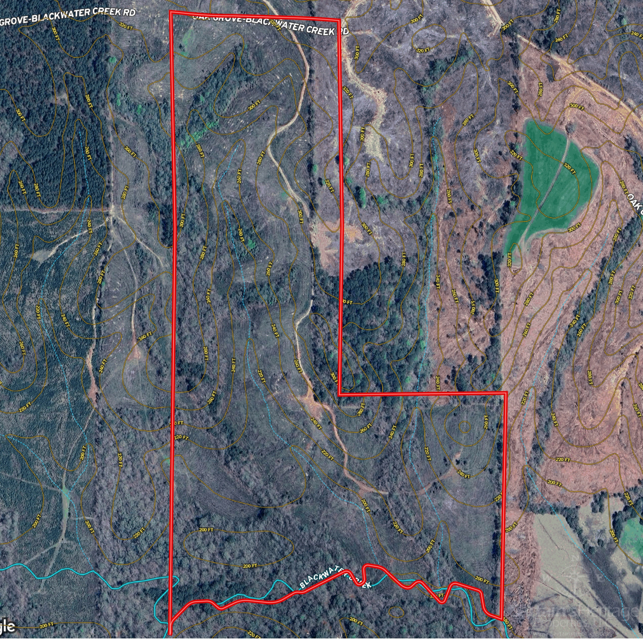 The tract features 116 acres of professionally managed recent replanted pine plantation and 66.5 acres of mature hardwood Streamside Management Zones, forming a vital wildlife corridor along the scenic Blackwater Creek. Elevations range from 320 feet on the ridges to 200 feet in the creek bottoms, providing dynamic topography and diverse habitats for deer, turkey, and small game.