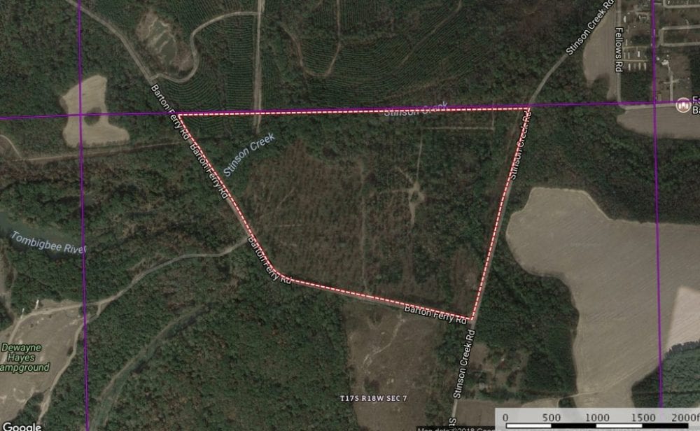 89.14 acres in S6 and 7, T17S, R18W, Lowndes County, MS fronting Stinson Creek Road and Barton Ferry Road four miles north of the Columbus. Utilities are available along Barton Ferry Road and is located in the Columbus Municipal School District. The property consists of 56 acres of cutover and 31 acres of hardwood Streamside Management Zone with frontage on Stinson Creek. Located across Barton Ferry Road from Dewayne Hayes Campground with a public boat launch allowing access to the Tombigbee River for fishing and boating opportunities.